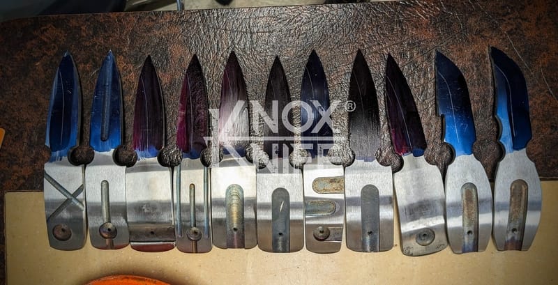 My buckle knives attach to the belt with a standard snap and the belt attaches to itself using a custom designed J hook. This system allows for the wearer to draw and sheath the knife, at will, without undoing the belt.