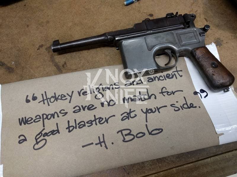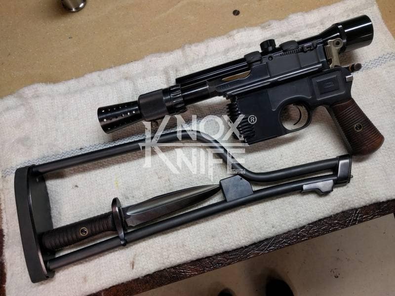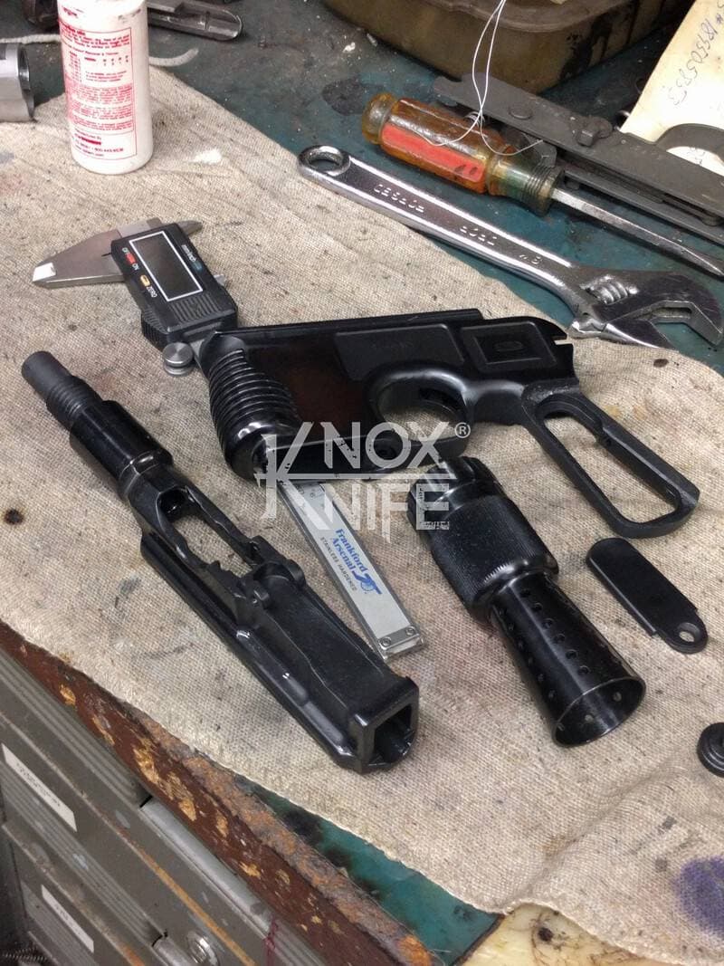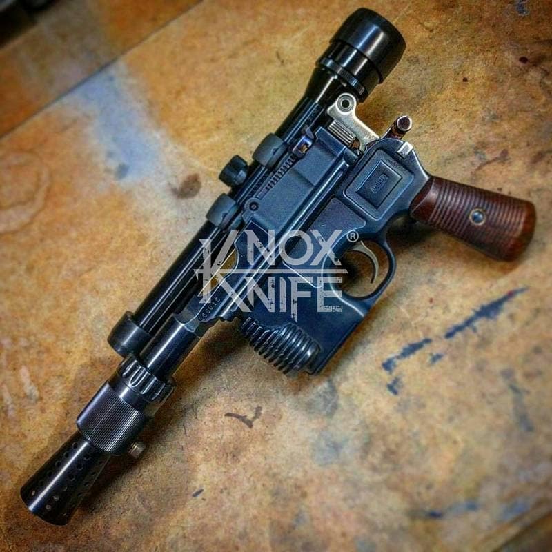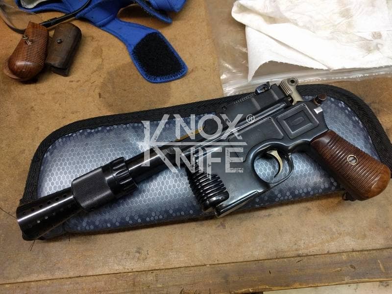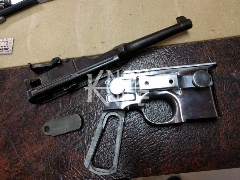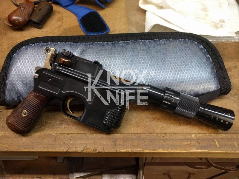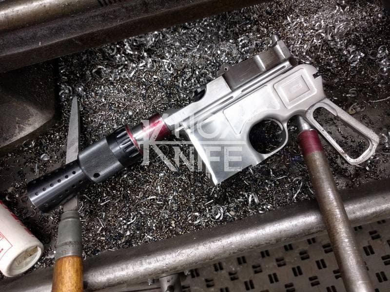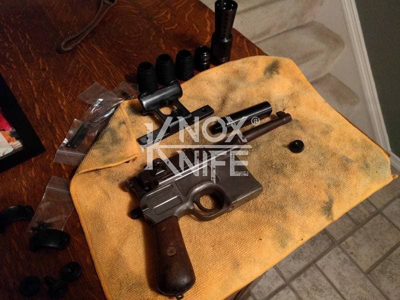 I got together with life long friend, gunsmith Otto M. from OTTOCOMP, find him on Facebook. We took it down to the white, re-chambered it in 9mm and built it back to what a Broomhandle would look like new and added on the Han Solo Star Wars blaster features in and on.