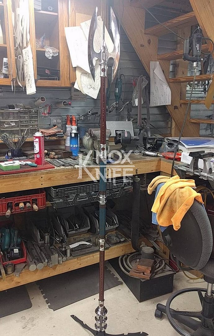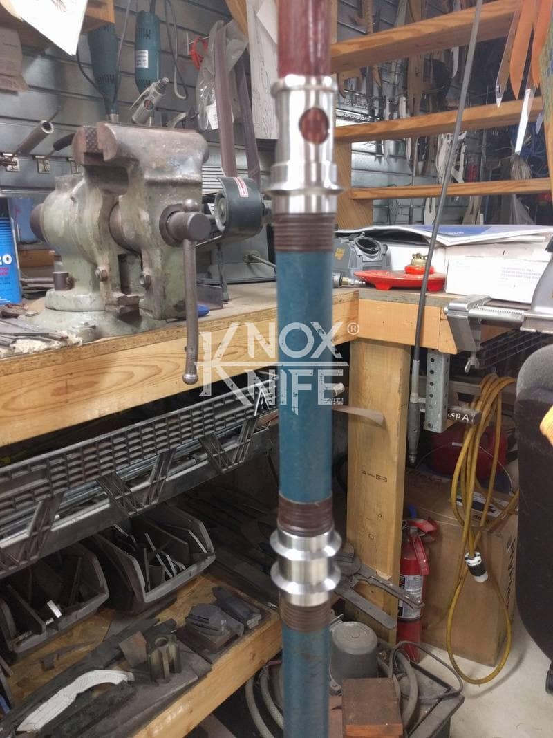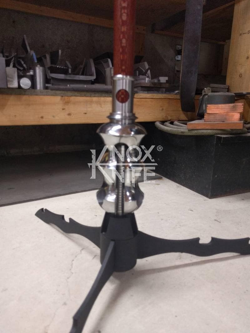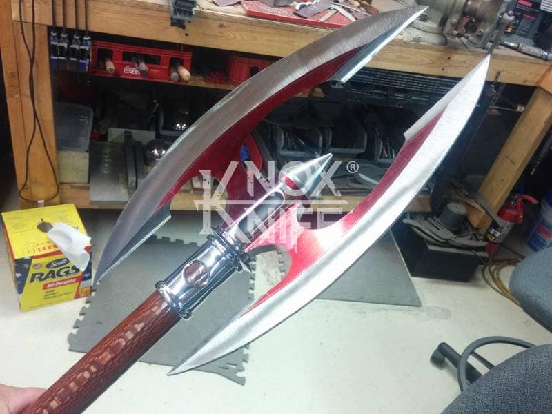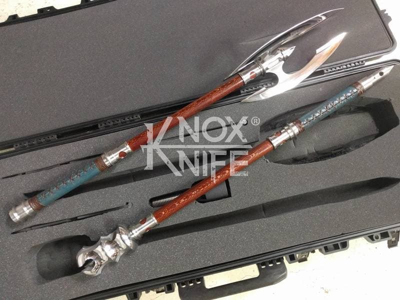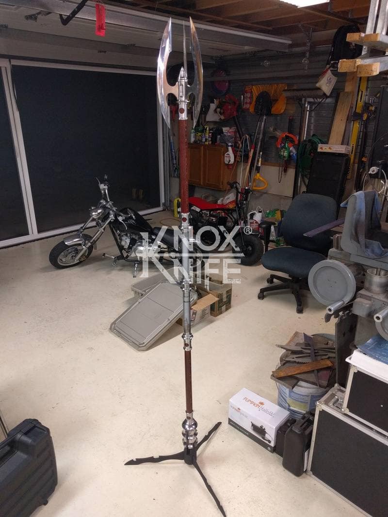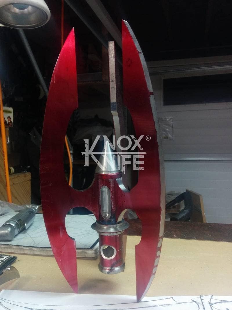 Being a gadget addict, I designed the MKII so if you push both grips towards the center and twist, the 1 weapon becomes 2 battle maces. I also made a vertical display stand that disassembles and also fits in the custom Pelican case.