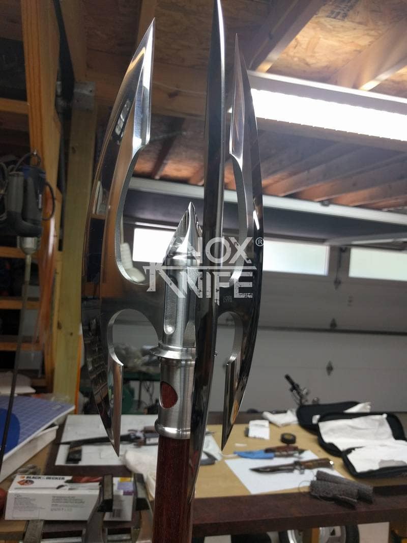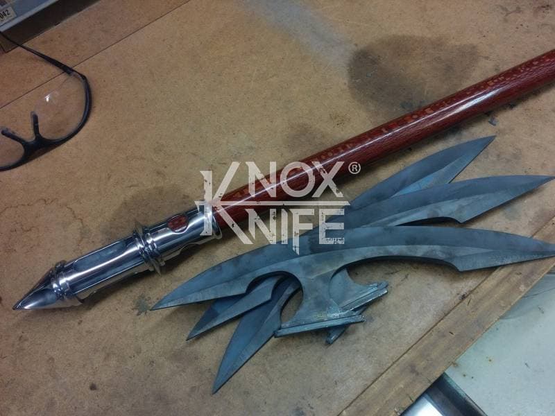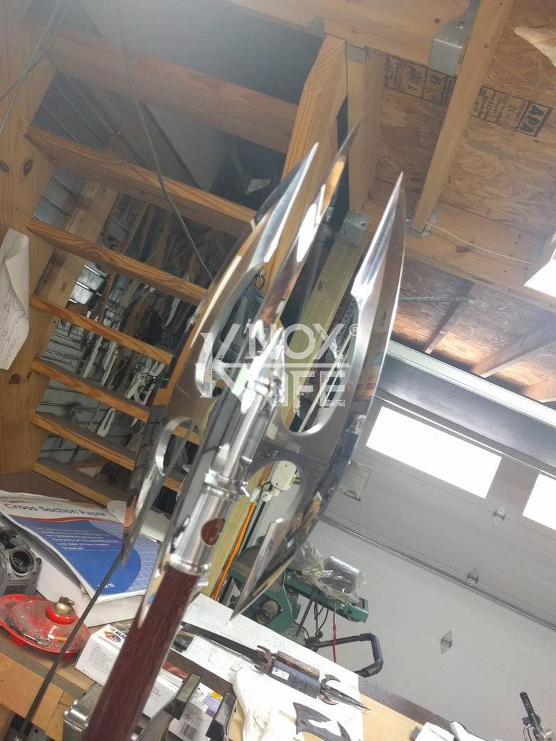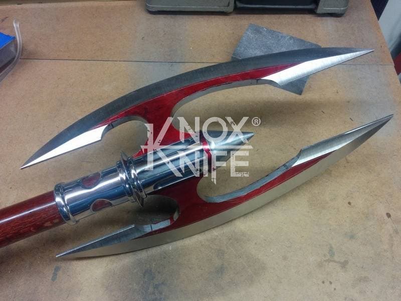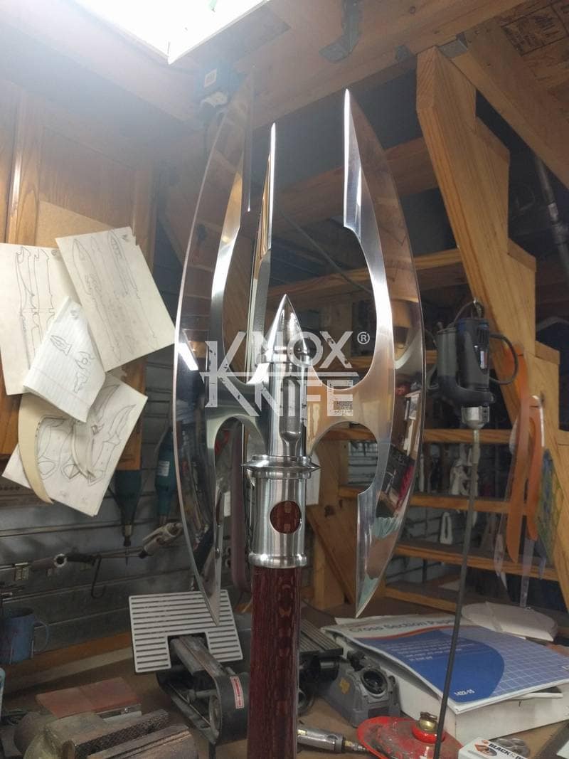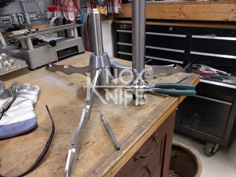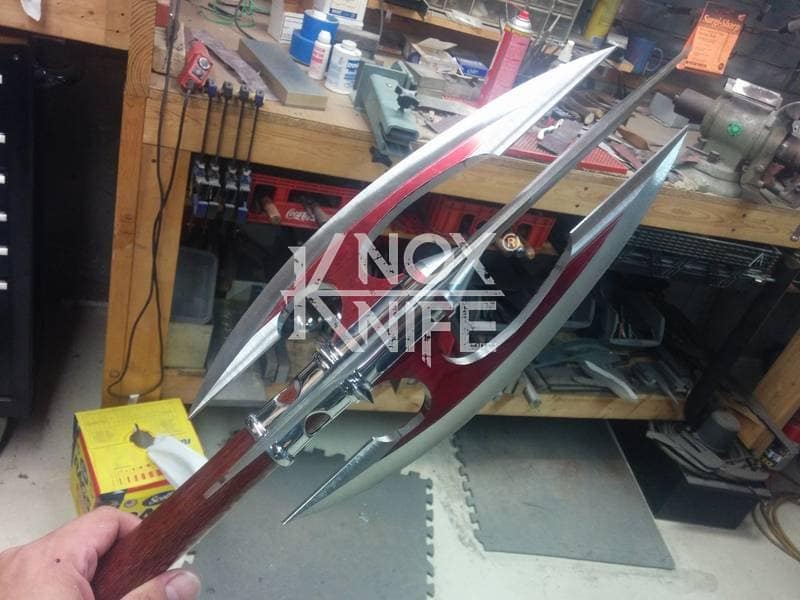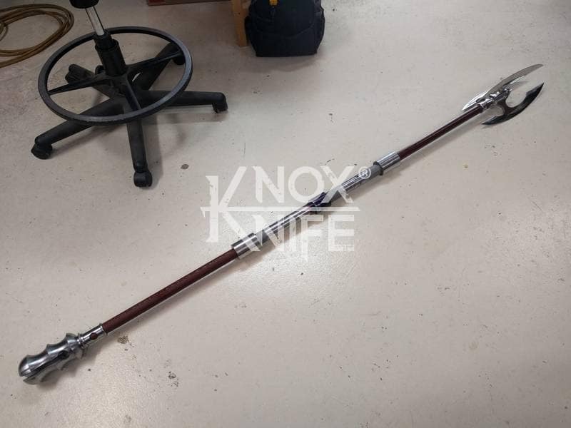 Being a gadget addict, I designed the MKII so if you push both grips towards the center and twist, the 1 weapon becomes 2 battle maces. I also made a vertical display stand that disassembles and also fits in the custom Pelican case.